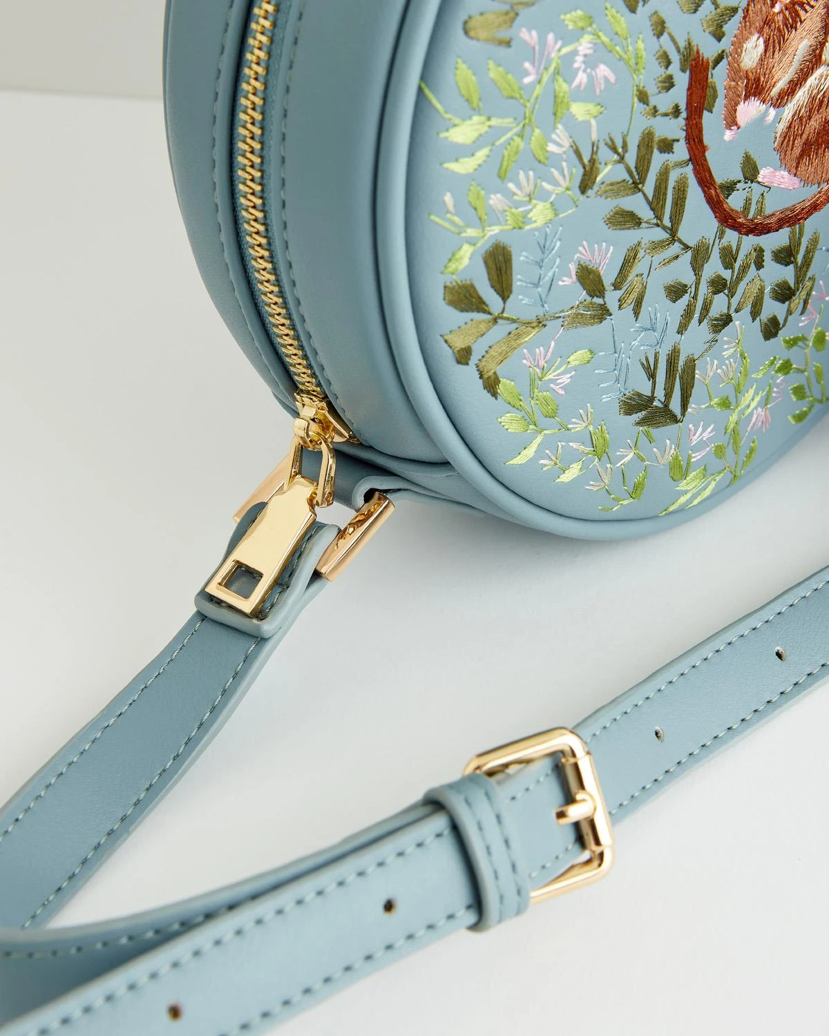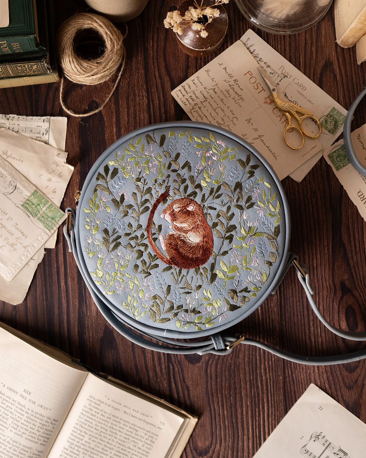 Chloe Giordano is freehand embroidery artist based in North Yorkshire, whose exquisite designs are the perfect match with Fable’s nature inspired woodland tales. The sleeping dormouse design is so adorable, we had to have it and so, Chloe kindly loaned us this little image of love to adorn our latest vegan leather round blue saddle bag.