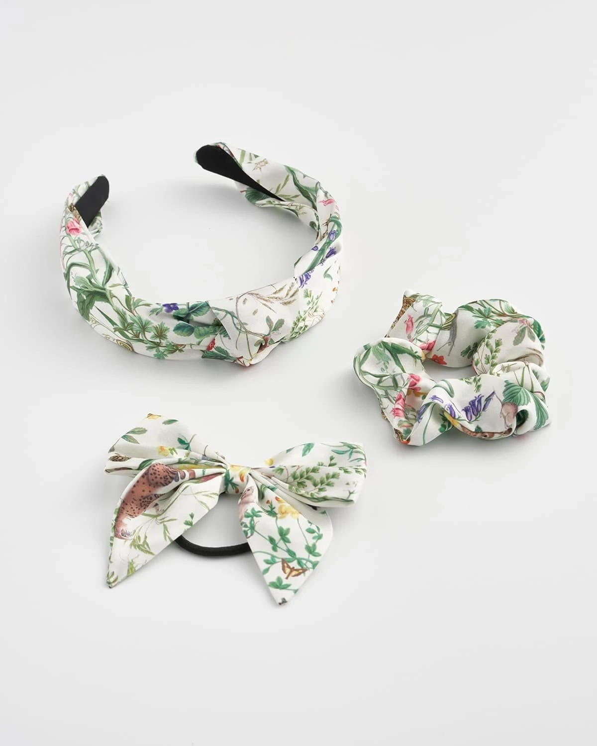 Create a touch of vintage charm with your hair style using these delightfully illustrated hair accessories in our beautiful Marshmellow print from our Meadow Creatures collection. The set of three hair accessories, crafted from recycled fabrics, consist of a headband, bow and scrunchie to allow you to create a range of masterful hair styles for the new season. Give your look a feminine re-fresh for the new months ahead.