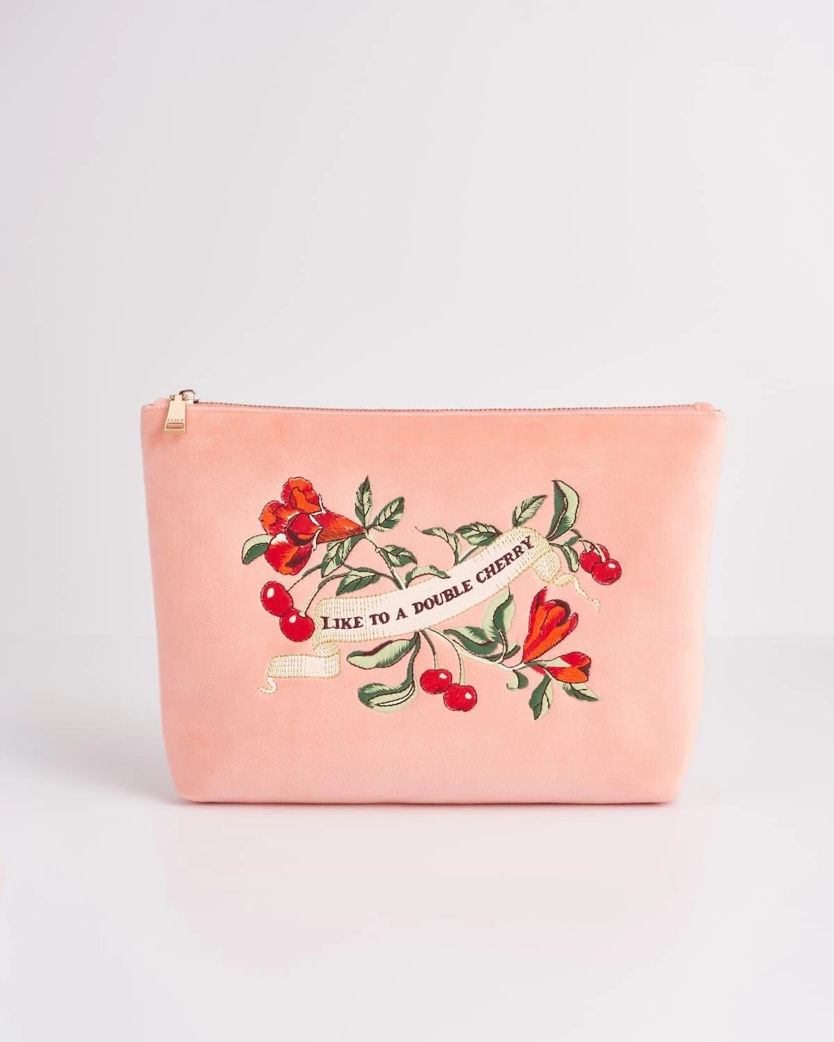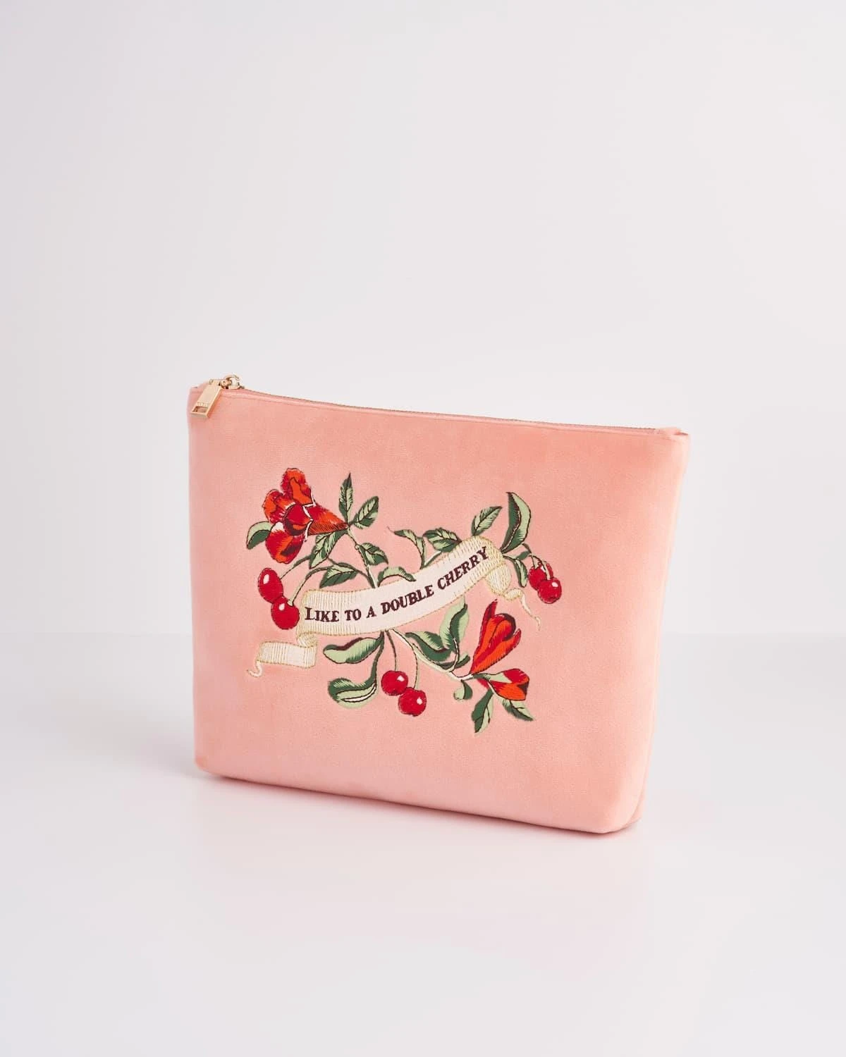 The vintage-inspired Cherry Embroidered Peach pouch from our Midsummer Dream collection depicts bountiful cherries set amongst wild, flowing fauna. With a stylish, gold-tone zip closure along the top, you’ll find this pouch is the ideal size for all your make-up essentials. Expertly crafted, this cosmetics pouch has a luxury velvet finish for an indulgent feel.