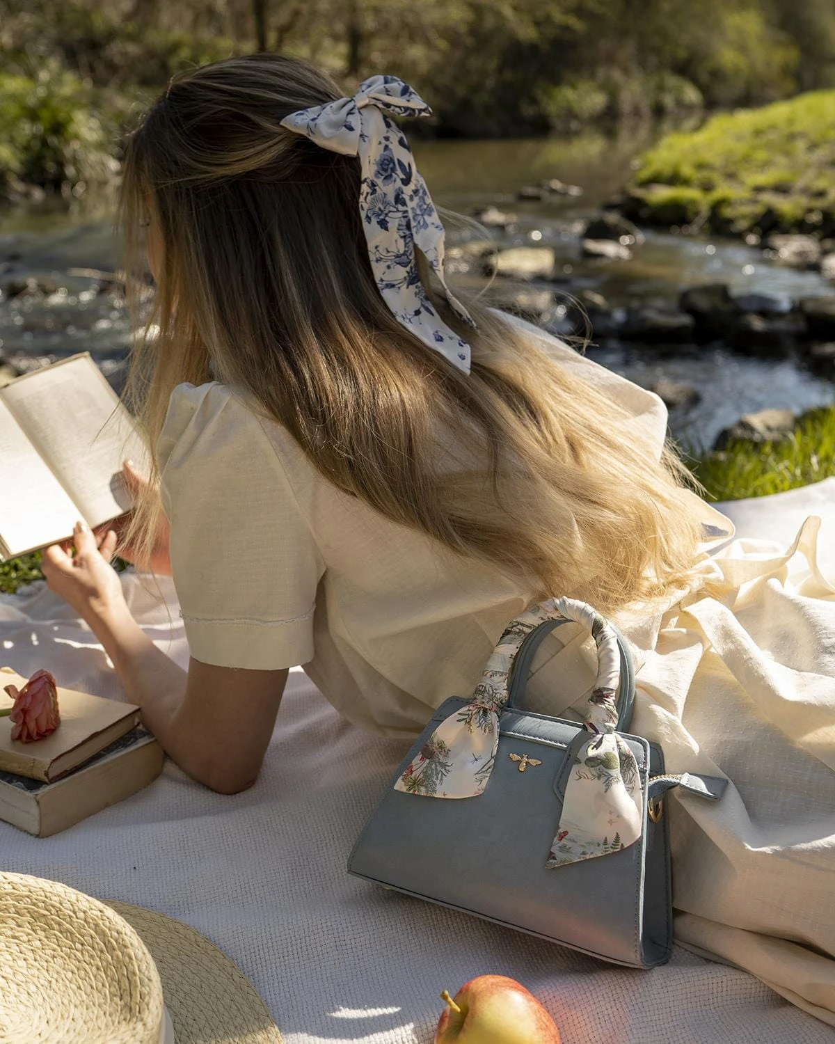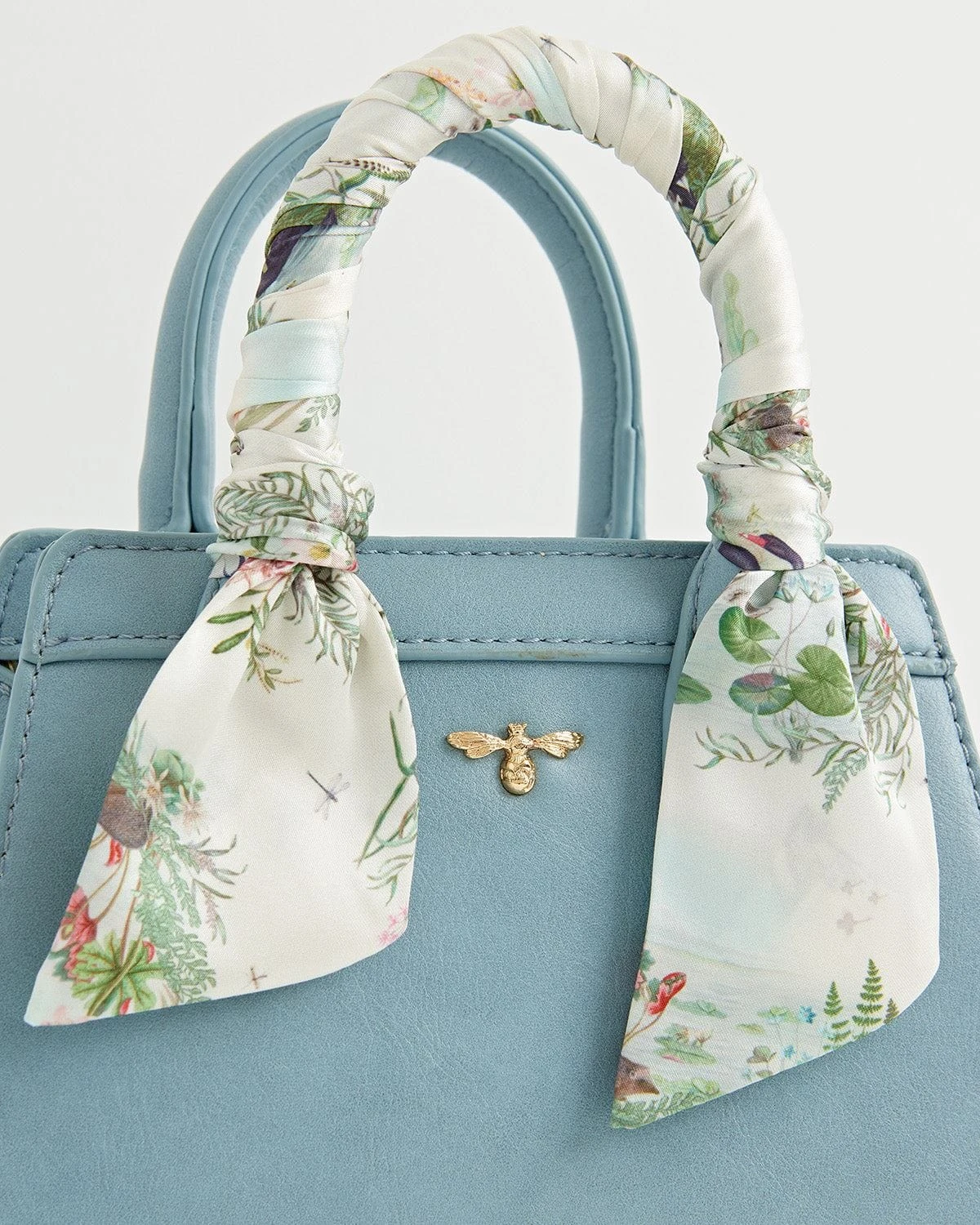 A classic tote of playful proportions, our mini tote must have taken a bite from the “Eat Me” plate! So compact, it strikes the perfect balance between a bag and a purse, ideal for popping out with your most wanted essentials. This structured miniature tote in fresh green recycled faux leather is perfect for Springtime adventures. Featuring our seasonal print, Whispering Willows, in the form of a silk-twilly scarf wrapped around the handle. Crafted with love using recycled materials.