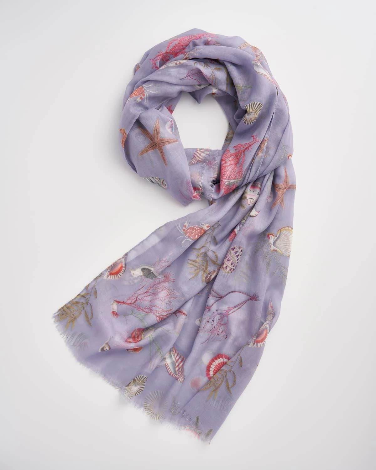 Let this luxuriously soft scarf drape over your shoulders as a delicate cover-up or wear as a sarong with the warm sun on your back and the waves lapping at your feet. Our Powder Blue Lightweight Scarf from our Whispering Sands collection transports us back to enchanting memories of collecting shells and sea treasures as well as spotting crabs and starfish. Notions of brightly coloured nets and an abundance of enthusiasm whilst trying to catch a darting fish. This feminine, versatile shell print accessory is one to treasure for years to come.